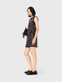 Rhinestone floral dress The collection highlights a sophisticated urban wardrobe, where every detail boldly illuminates the silhouette. This short sleeveless dress captivates with its opulent sequin embroidery, forming a dense floral pattern on a transparent tulle base that delicately reveals the upper bust. The collar and scalloped hem create a couture look, combining refined transparency with a luminous shine. For a bold, graphic silhouette, pair it with a black leather fringed bag and chunky loafers to play on the contrasting materials. - All-over floral sequin embroidered dress - Transparent tulle yoke - Round neck with sequin-trimmed collar - Short, straight cut, scalloped hem - Keyhole opening at the back - Black sequin trim on armholes and hem The model is 5' 10 and wears a size FR 36. Reference: MFPRO04629_2517 Composition & care Main material: 100% polyester Interior grosgrain: 100% cotton Removable lining: 90% polyester, 10% elastane Regular cycle 30° Do not bleach Do not tumble dry Do not iron Do not dry clean