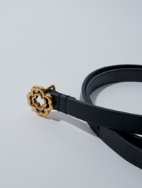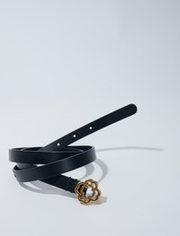 Slim Clover belt Narrow belt in smooth black leather. Clover buckle formed by gold metal Ms. - 7 holes for adjustment. - Length of size 1: 77.5 cm - Width: 2.5 cm. - Smooth black leather belt - Fancy buckle Reference: MFACE00353_2517 Composition & care Lining: 91% polyester, 9% viscose Coating: 100% polyurethane Buckle: 100% zamac Leather: cow Do not wash Do not bleach Do not tumble dry Do not iron Do not dry clean