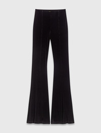 Stretch velour trousers This season, bold black pieces and precious accessories elevate every look with radiance, intensity and sophistication. Designed as a modern eveningwear piece, these velvet trousers combine comfort and style. Ideal for creating an elongated, confident silhouette, they can be paired with a fitted top or a structured jacket. A nighttime wardrobe essential, where black becomes vibrant and magnetic. Style with a short faux fur coat, heels and a rhinestone-embellished bag. - Stretch velvet trousers - Flowing fit and flared leg - Comfortable elasticated waist - Designed for a slim fit The model is 5' 10 and wears a size 36. Reference: MFPPA00767_2517 Composition & care Main material: 90% polyester, 10% elastane Elastic: 57% polyester, 43% elastodiene Regular cycle 30° Do not bleach Do not tumble dry Do not iron F/ - Professional dry clean, with hydrocarbon solvent, gentle treatment