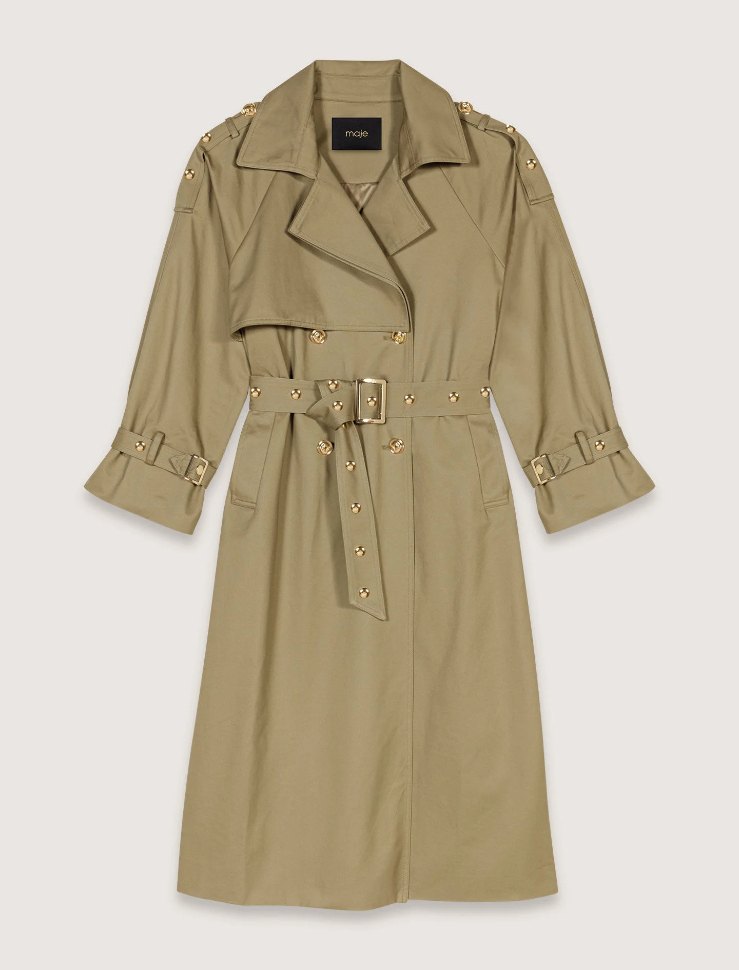 Studded trench coat With comfortable materials and pastel colours, our collection celebrates a new kind of romanticism, where the Maje woman asserts herself confidently and effortlessly everyday. This long gabardine trench coat has a fitted silhouette thanks to its removable belt with studs and double fastening with gold Clover officer buttons. The shoulder and cuff plackets, two pockets and storm flaps structure this timeless piece. One of the studio's favourites, it pairs easily with a shirt, jeans and sandals. - Long gabardine trench coat - Side and back storm flap - Button plackets on shoulders - Adjustable belt with rivets - Double breasted with gold Clover officer buttons - Adjustable wrist plackets - Back slit - 2 pockets - Removable collar - Designed for a standard fit. Take your true size The model is 5' 10 and wears a size FR 36. Reference: MFPOU01335_0020 Composition & care Main material: 100% cotton Lining: 100% polyester Hand wash Do not bleach Do not tumble dry Iron at a maximum temperature of 110°C without steam F/ - Professional dry clean, with hydrocarbon solvent, gentle treatment