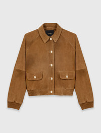 Suede jacket Inspired by the light of the open sea, this piece creates a sunny, confident look, where the refined, natural quality of suede meets the subtle shine of gold details for a silhouette that combines character and freedom. This camel jacket, with its loose, cropped fit, stands out with its suede enhanced by a matte finish and a velvety feel. The gold buttons add brightness, while the discreet topstitching and flap pockets give the piece structure. The gathered hem and cuffs add soft, modern volume. Pair it with the matching suede short skirt , a textured white shirt , leather loafers and a Milpli Gazette bag for a bright, urban look. - Cropped goatskin suede jacket - Matte finish and velvety feel - Gold buttons - Two flap pockets The model is 5' 10 and wears a size FR 36. Reference: MFPBL00839_0067 Composition & care Lining: 100% polyester Leather: goatskin leather Do not wash Do not bleach Do not tumble dry Do not iron Do not dry clean