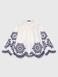 Top court en crochet The studio takes us to Italy, from Milan to Lake Como, for a new take on classic elegance and femininity. A dolce vita style with a touch of humour and plenty of glamour, as always.Ideal for warm weather, this short, loose shirt is embellished with contrasting embroidered flowers. Featuring a Peter Pan collar and button fastening, it has delicately scalloped edges on the bottom and sleeves. - Short shirt with crochet detail - Contrasting embroidered guipure flowers - Scalloped at the bottom - Designed for a boxy fit Reference: MFPCM00707_O025 Composition & care Main material: 100% cotton Embroidery: 100% polyester Regular cycle 30° Do not bleach Do not tumble dry Iron at a maximum temperature of 110°C without steam F - Professional dry clean, with hydrocarbon solvent, normal treatment