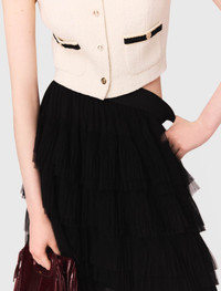Tulle midi skirt Flared midi skirt with pleated and layered tulle ruffles. Perfect for structuring the figure, it can be worn with a simple top to ensure a very casual chic look for special occasions. Inlaid black elasticated belt. Silky lining. The model is 5' 10 and wears a size 36. Reference: MFPJU00675_2517 Composition & care Main fabric: 100% polyester Lining: 100% viscose Elastic: 77% polyester, 23% elastodiene Regular cycle 30° Do not bleach Do not tumble dry Do not iron Do not dry clean