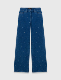 Wide jeans with rhinestones The sparkle of rhinestones meets the strength of denim: this piece reflects the confidence of a modern woman, ready to own every detail and assert her style with complete freedom. - Wide-leg jeans with rhinestones - Straight cut and high waist - All-over geometric pattern in silver rhinestones - Ochre topstitching - 5 practical pockets - Calfskin leather jacron Reference: MFPJE00790_0201 Composition & care Main material: 100% cotton Pocket lining: 80% polyester, 20% cotton Jacron: calfskin leather Regular cycle 30° Do not bleach Do not tumble dry Iron at a maximum temperature of 110°C without steam Do not dry clean