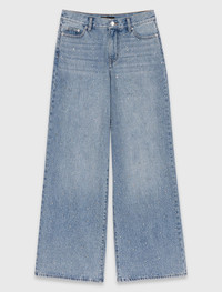 Wide-leg all-over rhinestone jeans Embodying confidence and light, the Chinese New Year capsule collection is dazzling without ever losing its modern edge. These wide-leg, 100% cotton denim jeans stand out with sparkling all-over rhinestones, blending iconic style with contemporary sparkle. Their high-waisted cut structures the silhouette, while the signature patch on the back completes the look. Pair them with an off-white rib knit top and platform shoes for a decidedly confident look that's full of character. - Wide-leg, high-waisted fit - All-over silver rhinestones - 100% cotton denim - 5 classic pockets - Contrasting ochre topstitching - Leather-effect jacron on the back The model is 5' 10 and wears a size FR 36. Reference: MFPJE00786_0201 Composition & care Main material: 100% cotton Pocket lining: 81% polyester, 19% cotton Jacron: cow leather Regular cycle 30° Do not bleach Do not tumble dry Do not iron Do not dry clean