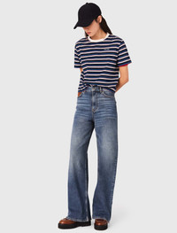 Wide-leg jeans Designed to accompany sunny days in style, the Maje collection blends metropolitan spirit with timeless cuts. These wide-leg, slightly faded and flared jeans create a stylish silhouette. Featuring a chain belt with tassels at the waist, they're a timeless piece to mix and match as you wish. Casual with a T-shirt, chic with a blazer. Pair with seasonal essentials like a striped T-shirt, a cap, and chunky boots. - High-waisted studded wide-leg jeans - 5 pockets and signature Clover jacron on the back - Removable chain belt with tassels - Designed for a standard fit The model is 5' 10 and wears a size 36. Reference: MFPJE00751_0201 Composition & care Main material: 99% cotton, 1% elastane Pocket lining: 67% polyester, 33% cotton Jacron: calfskin leather Regular cycle 30° Do not bleach Do not tumble dry Iron at a maximum temperature of 110°C without steam F - Professional dry clean, with hydrocarbon solvent, normal treatment