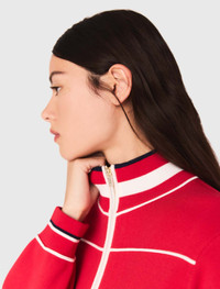 Zipped cardigan with elastic waist The collection reinvents classics with a graphic and modern touch, drawing inspiration from nautical codes to reinterpret wardrobe essentials. This zip-up cardigan stylishly reimagines sportswear. With long sleeves, a zip fastening and adorned with contrast finishes, it creates a contemporary and stylish silhouette. For a bold look, add the matching skirt and opt for the season's signature accessories: chunky boots and a cargo bag. - Ribbed knit zip-up cardigan - High collar and long sleeves - Sporty contrast trim - Two front patch pockets - Designed for a boxy fit The model is 5' 10 and wears a size 1. Reference: MFPCA00628_0515 Composition & care Main material: 73% viscose, 26% polyamide, 1% elastane Rib: 73% viscose, 26% polyamide, 1% elastane Hand wash Do not bleach Do not tumble dry Iron at a maximum temperature of 110°C without steam F - Professional dry clean, with hydrocarbon solvent, normal treatment