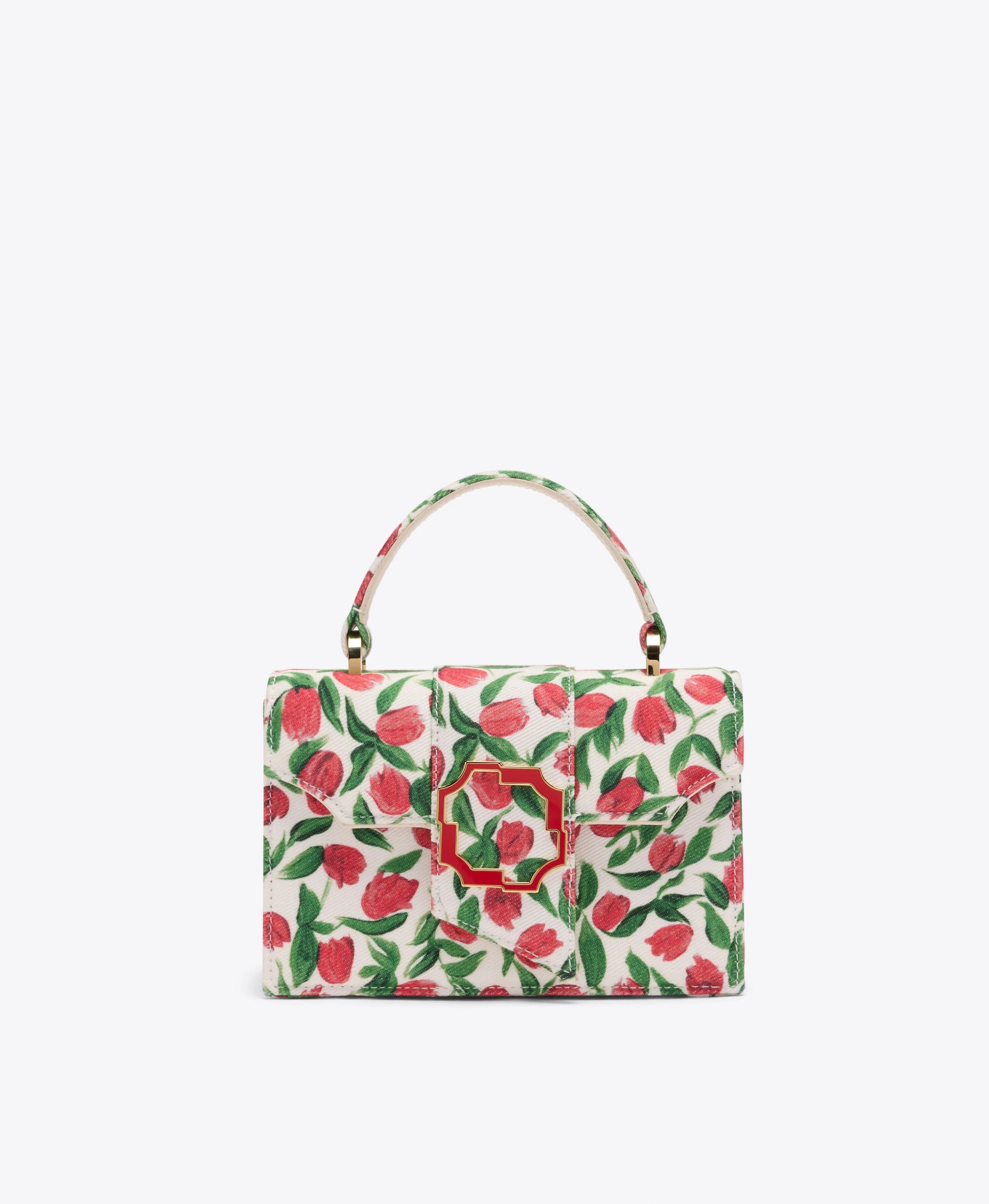A celebration of the season in full bloom. For SS26, the Audrey Mini returns in textured cotton canvas, printed with a vibrant red tulip motif inspired by hand-painted artwork from our London studio. Finished with a crest buckle, it captures the collection's joyful spirit of self-expression. - Colour: Red/Milk - Material: Tulip Canvas/Nappa - Lining: Microfibre Fabric - Style: Top Handle Bag - Handmade in Italy SIZE & FIT - Width: 18cm - Depth: 8cm - Height: 12cm - Top handle drop: 8.5cm - Additional chain drop: 52cm