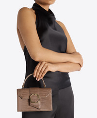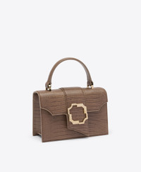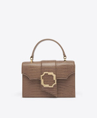 A sculptural statement in refined texture. The Audrey Mini handbag returns for the new season in embossed calf leather with a structured, squared silhouette. Accented by Malone Souliers' signature gold crest buckle and lined in soft microfibre, it's perfectly sized for the essentials. - Colour: Taupe - Material: Embossed Leather/Calf - Lining: Microfibre Fabric - Style: Handbag - Handmade in Italy SIZE & FIT - Width: 18cm - Depth: 8cm - Height: 12cm - Additional chain drop: 52cm