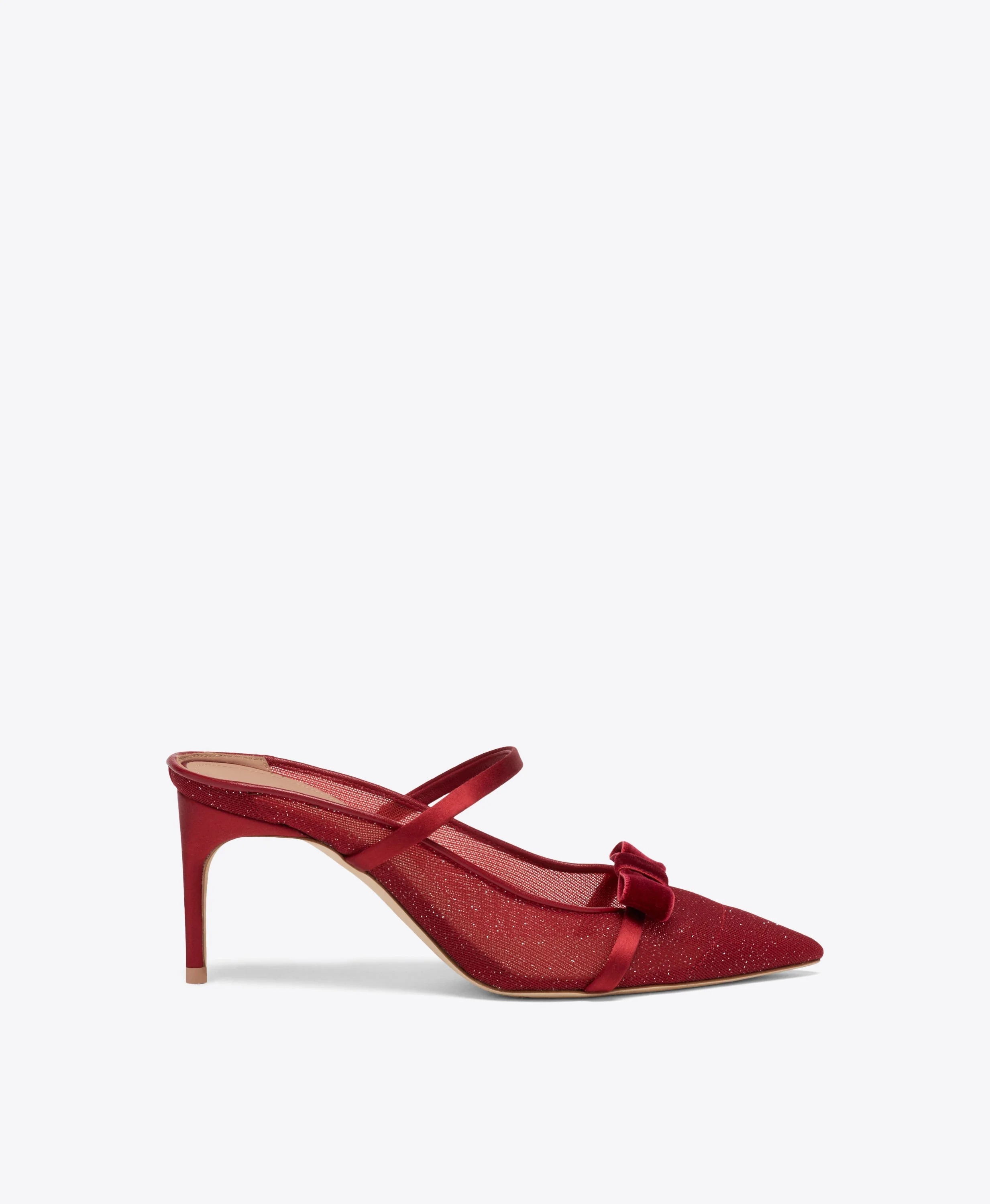 The Aurora mule returns in a festive red finish for our Holiday capsule. Crafted from red glitter mesh with tonal satin trims and a velvet bow, this pointed-toe silhouette is set on a slender 70mm stiletto heel. Equal parts playful and striking, Aurora brings a bold spark to evening looks. - Colour: Red/Scarlet - Material: Glitter Mesh/Metallic Nappa/Velvet - Sole and Lining: 100% Leather - Style: Heeled Mules - Handmade in Italy - Fitting: True to size SIZE & FIT - True to size - Italian sizing - Model wears size IT37, US7, UK4 - Heel height 70mm/2.7in