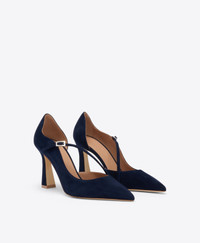 Exclusive to Malone Souliers, the Bettina pump offers a fresh perspective on feminine design. Crafted in rich navy suede, this pointed D'Orsay silhouette is defined by its softly curved upper and sculptural 90mm flared block heel. A slender diagonal strap crosses the foot, secured by an angular buckle for a precise, contemporary finish. Refined, modern and endlessly versatile. - Colour: Midnight - Material: Suede - Sole and Lining: 100% Leather - Style: Heeled Pumps - Handmade in Italy - Fitting: Fits large to size, half size down is recommended - Online Exclusive SIZE & FIT - Fits large to size, half size down is recommended - Italian sizing - Model wears size IT37, US7, UK4 - Heel height 90mm/3.5in