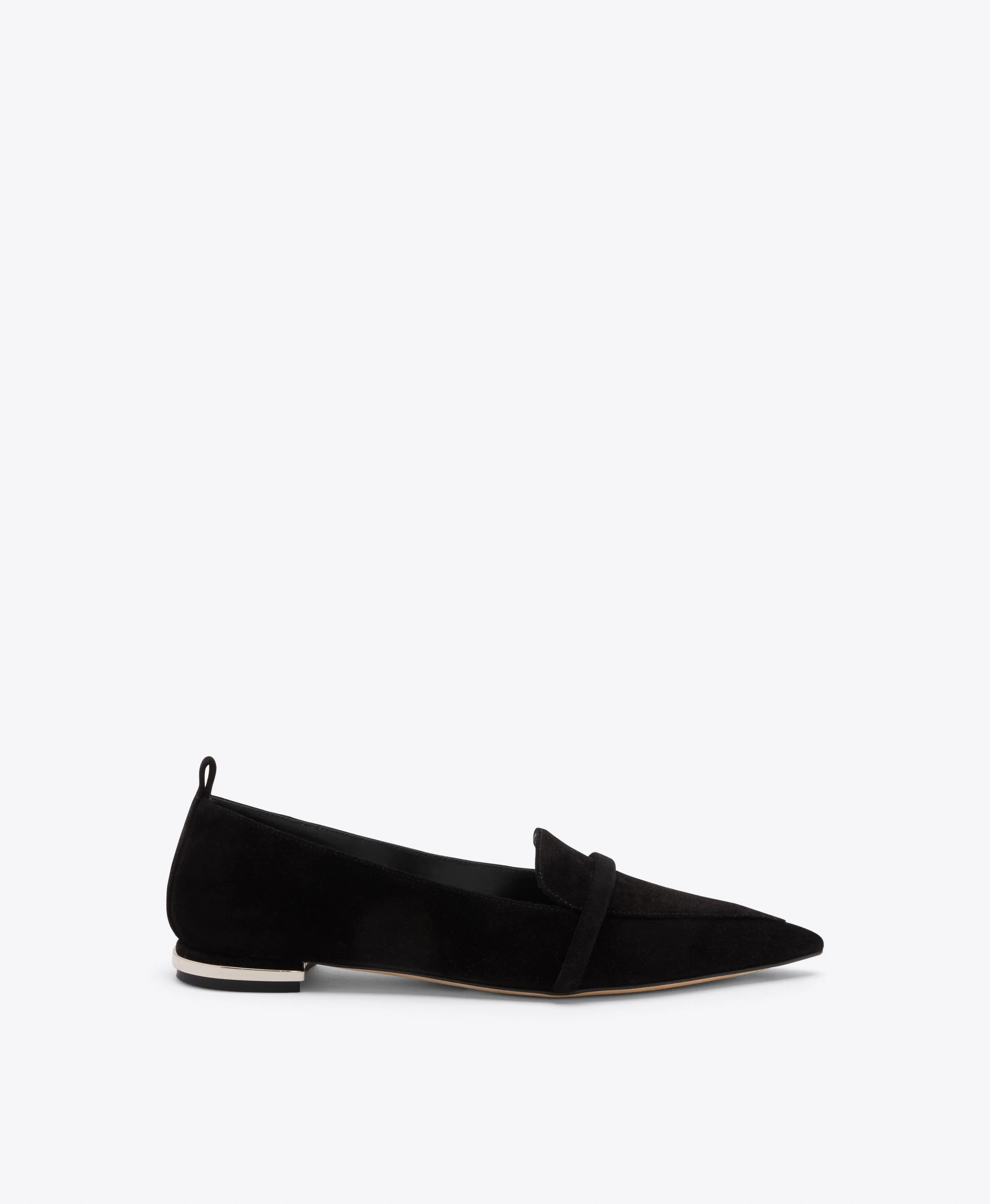 A classic loafer that's elegant, effortless, and endlessly wearable. Crafted from soft black suede, the Dora loafer evokes timeless sophistication with a modern edge. Its sharply pointed toe and signature strap echo the sharp tailoring that defined cinema's golden age, while a sculpted 10mm monoblock heel and subtle metal accent lend an architectural finish. - Colour: Black - Material: Suede - Sole and Lining: 100% Leather - Style: Loafers - Handmade in Italy - Fitting: Fits small to size, take half a size larger SIZE & FIT - Fits small to size, take half a size larger - Italian sizing - Model wears size IT37, US7, UK4 - Heel height 10mm/0.4in