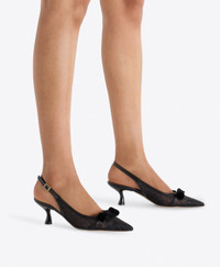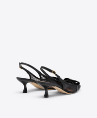 Jama steps into the holiday season in glittering black mesh. Framed by smooth Nappa trims and finished with a velvet bow, the pointed-toe silhouette is set on a sculpted 45mm curved heel. From dinner to dance floor, Jama brings graceful glamour to every festive moment. - Colour: Black - Material: Glitter Mesh/Nappa/Velvet - Sole and Lining: 100% Leather - Style: Kitten Heel Slingbacks - Handmade in Italy - Fitting: True to size SIZE & FIT - True to size - Italian sizing - Model wears size IT37, US7, UK4 - Heel height 45mm/1.7in