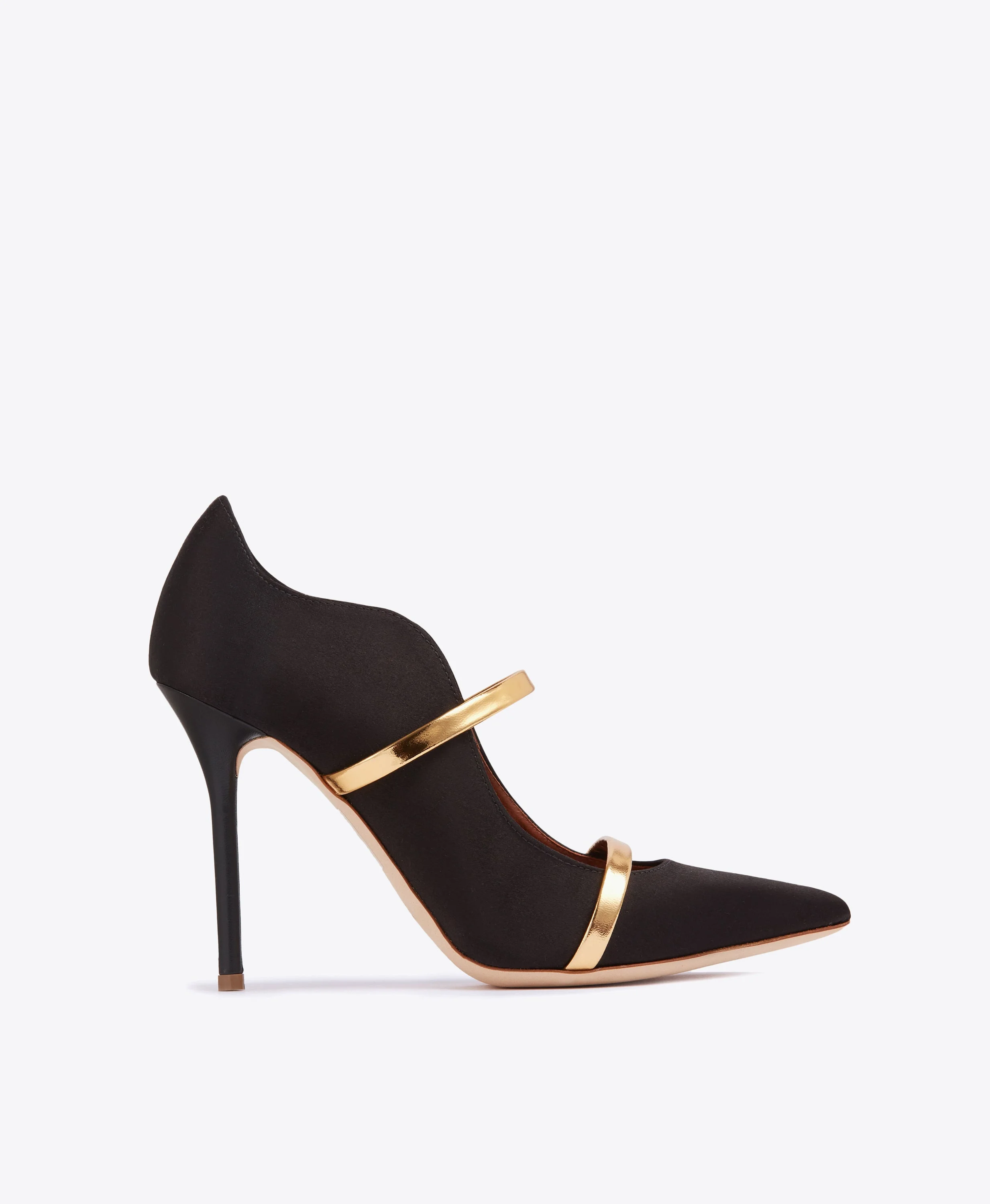 An icon of feminine sophistication, we made our name with the Maureen. A stiletto heel in black satin with an unmistakeable wave-like silhouette, the Maureen combines graceful lines with superior comfort. Dispensing with the usual backless design in favour of a closed heel, it is finished with a padded insole and stretchable arch strap in contrasting gold mirror leather. - Colour: Black/Gold - Material: Satin/Mirror Leather - Sole and Lining: 100% Leather - Style: Stiletto Heel - Handmade in Italy SIZE & FIT - Fits small to size, take half a size larger - Italian sizing - Model wears size IT37, US7, UK4 - Heel height 100mm/4in