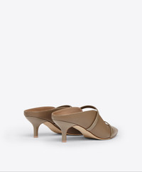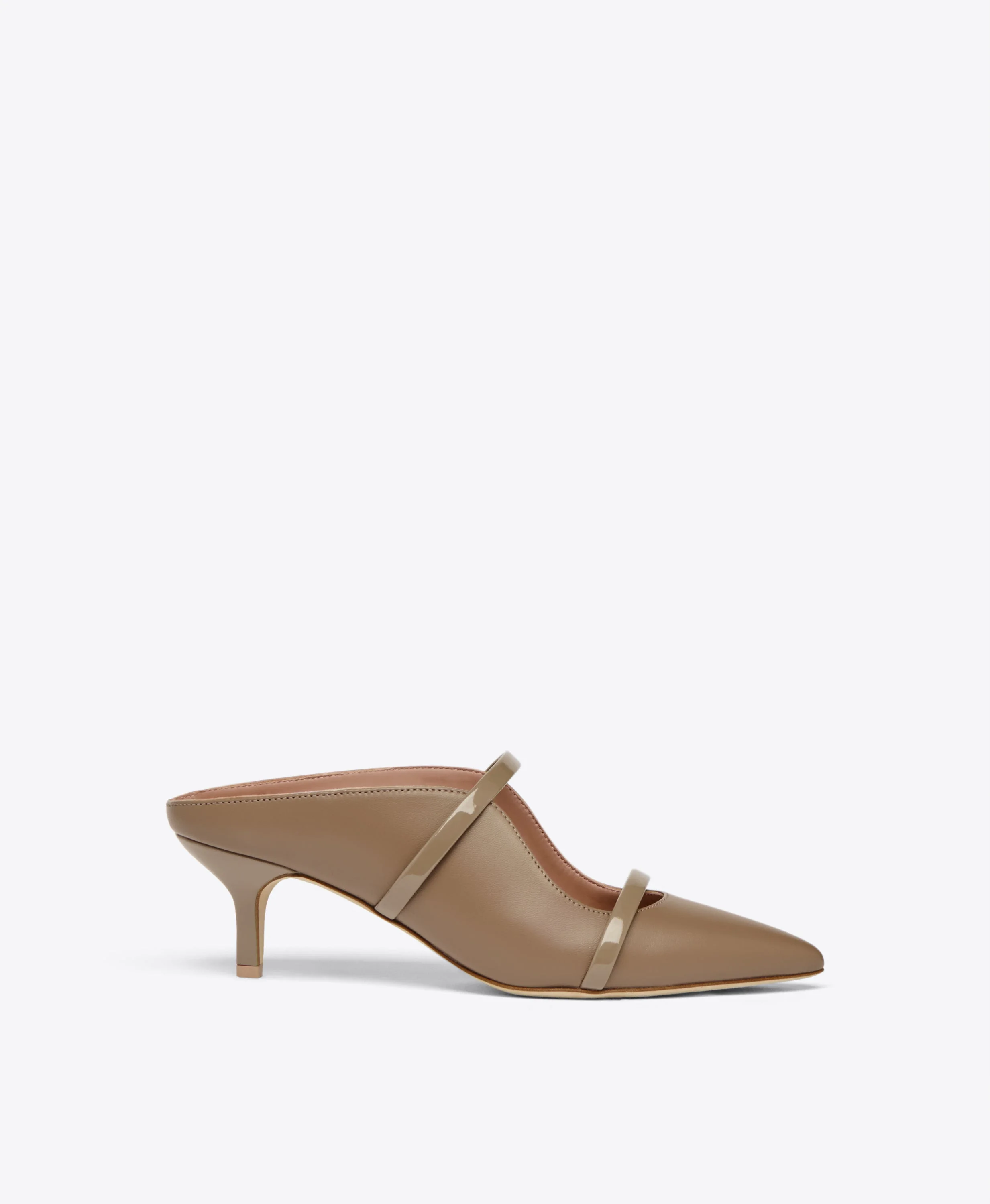 An icon of feminine sophistication, we made our name with the Maureen. Maureen's latest reimagining combines the iconic statement silhouette with a 45mm kitten heel. Crafted from taupe Nappa leather with contrasting glossy patent straps, this new iteration is a stylish choice for any occasion. - Colour: Taupe - Material: Nappa/Patent - Sole and Lining: 100% Leather - Style: Heeled Mules - Handmade in Italy - Fitting: Fits small to size, take half a size larger SIZE & FIT - Fits small to size, take half a size larger - Italian sizing - Model wears size IT37, US7, UK4 - Heel height 45mm/1.7in