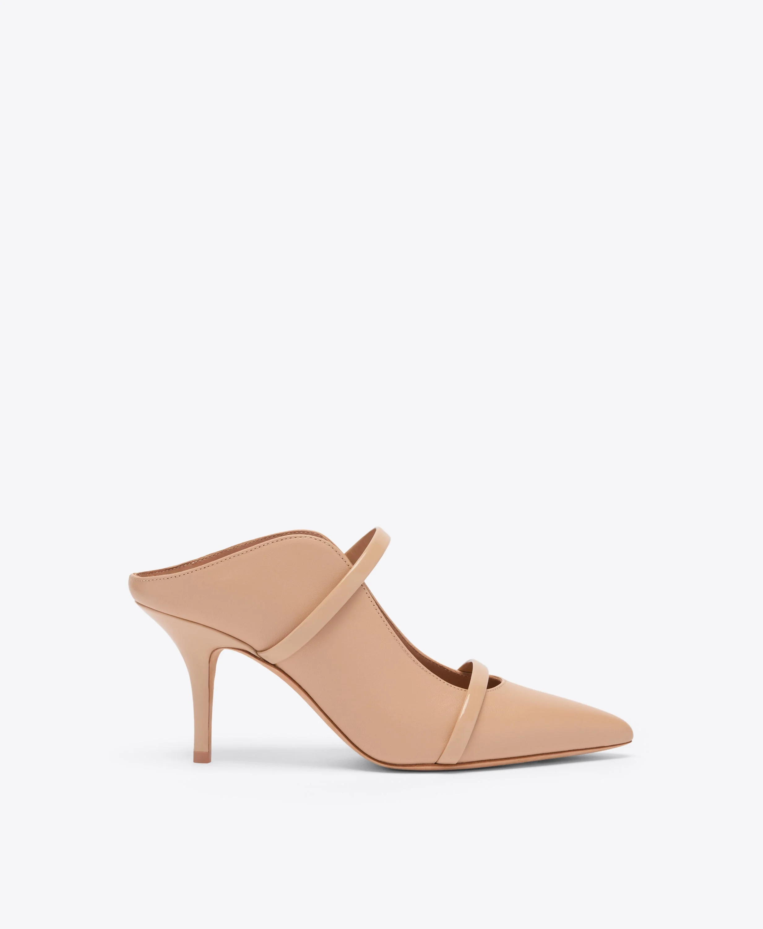 An icon of feminine sophistication, we made our name with the Maureen. Our signature silhouette is reimagined in soft Buff Nappa leather - a refined neutral that will pair effortlessly with almost anything. Shaped with a pointed toe and finished with double patent straps for subtle contrast, this 70mm stiletto offers timeless elegance and effortless wearability from day to night. - Colour: Buff - Material: Nappa/ Patent - Sole and Lining: 100% Leather - Style: Heeled Mules - Handmade in Italy - Fitting: Fits small to size, take half a size larger SIZE & FIT - Fits small to size, take half a size larger - Italian sizing - Model wears size IT37, US7, UK4 - Heel height 70mm/2.7in