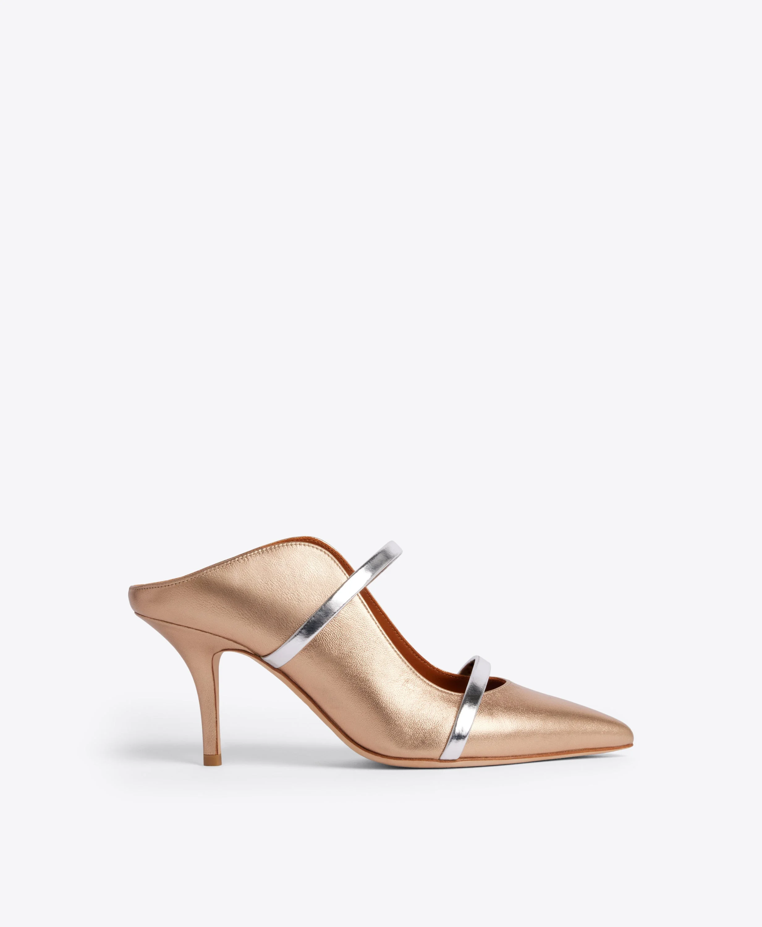 An icon of feminine sophistication, we made our name with the Maureen. A heeled mule in gold metallic nappa with an unmistakeable wave-like silhouette, the Maureen combines graceful lines with superior comfort. The backless design and elegant 70mm heel are complemented by a padded insole and stretchable straps in contrasting silver mirror leather. - Colour: Gold/Silver - Material: Metallic Nappa/Mirror Leather - Sole and Lining: 100% Leather - Style: Stiletto Mule - Handmade in Italy SIZE & FIT - Fits small to size, take half a size larger - Italian sizing - Model wears size IT37, US7, UK4 - Heel height 70mm/2.7in