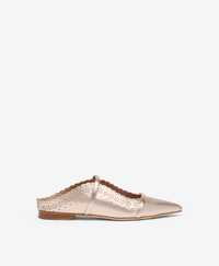 A Malone Souliers signature silhouette traced with intricate cutwork. The Maureen flat mule steps into the season in champagne metallic Nappa leather, finished with a laser-cut design inspired by traditional Broderie Anglaise. Framed by the silhouette's signature double straps and pointed toe, it's set on a minimal 10mm heel. - Colour: Champagne - Material: Metallic Nappa - Sole and Lining: 100% Leather - Style: Flat Mules - Handmade in Italy - Fitting: Fits small to size, take half a size larger SIZE & FIT - Fits small to size, take half a size larger - Italian sizing - Model wears size IT37, US7, UK4 - Heel height 10mm/0.4in