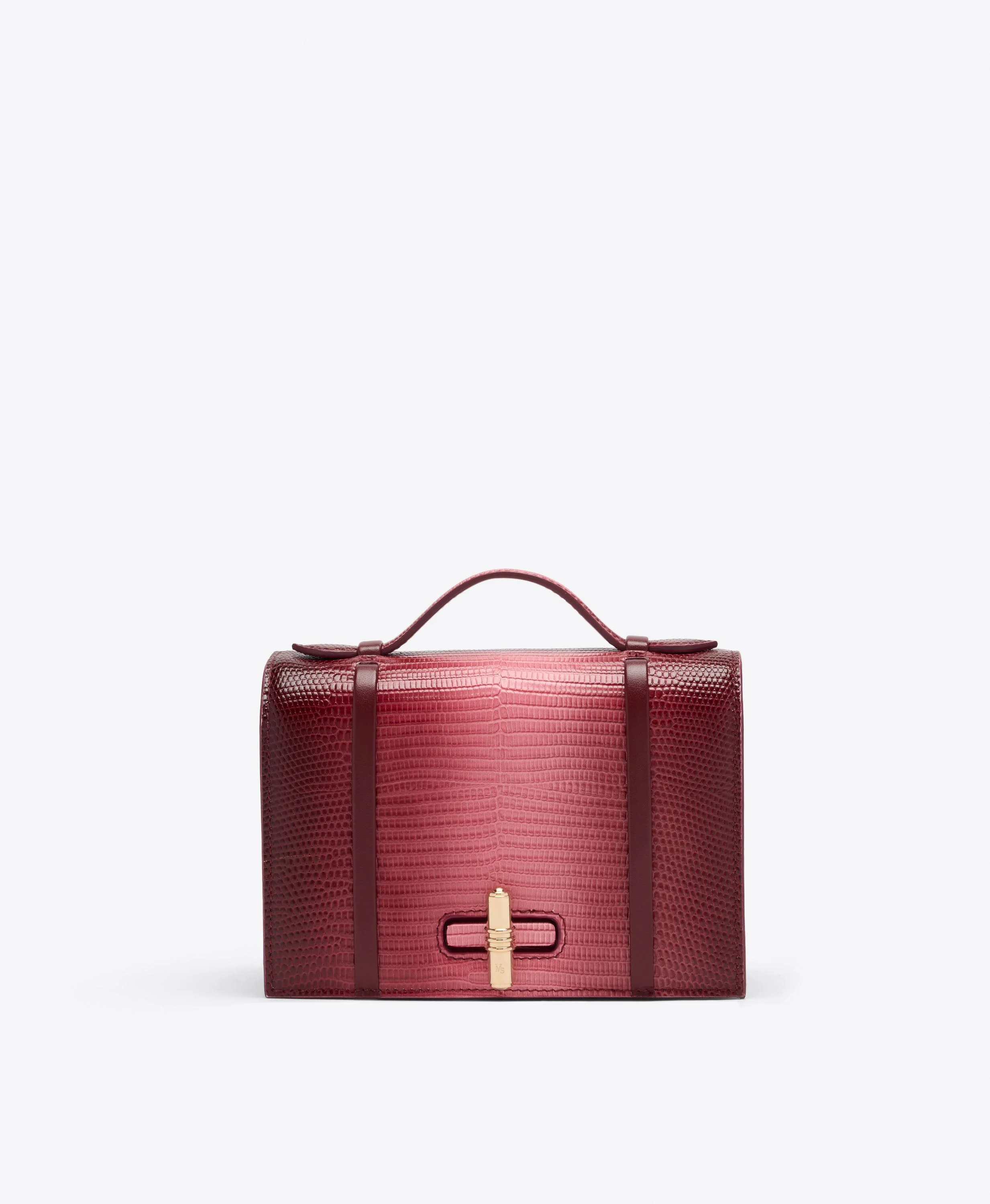 An evolution of elegance in tonal texture. The May Small handbag is hand-dyed in rosewood degrade embossed leather, creating a seamless gradient of colour and depth. Compact yet structured, it's defined by its curved top handle and signature twist-lock closure. - Colour: Rosewood - Material: Degrade Embossed Leather Tejus/Nappa - Lining: Microfibre Fabric - Style: Top Handle Bag - Handmade in Italy SIZE & FIT - Width: 18cm - Depth: 7cm - Height: 13cm - Additional chain drop: 51cm