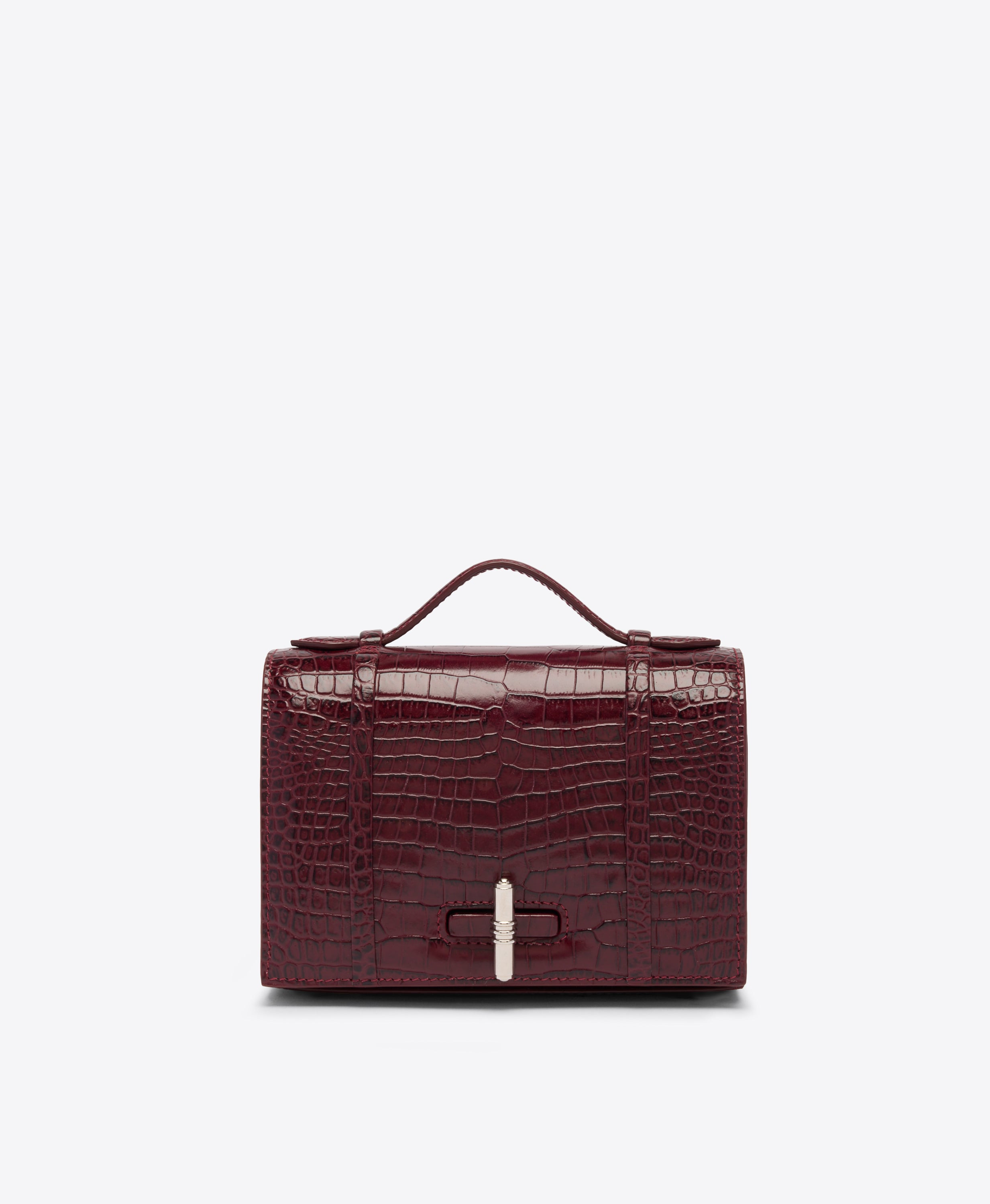 The May Small handbag debuts for AW25 with geometric precision and meticulous craftsmanship. A modern expression of timeless elegance, this new-season silhouette is expertly crafted from rosewood-red croc-embossed leather. Its structured silhouette is punctuated by a silver-tone twist-lock closure - detail inspired by the glamour of vintage metal lipstick cases. Designed with versatility in mind, it features an internal card slot and a detachable chain strap. - Colour: Rosewood - Material: Embossed Leather/ Calf Leather - Lining: Microfibre Fabric - Style: Handbag - Handmade in Italy SIZE & FIT - Width: 18cm - Depth: 7cm - Height: 13cm - Additional chain drop: 51cm