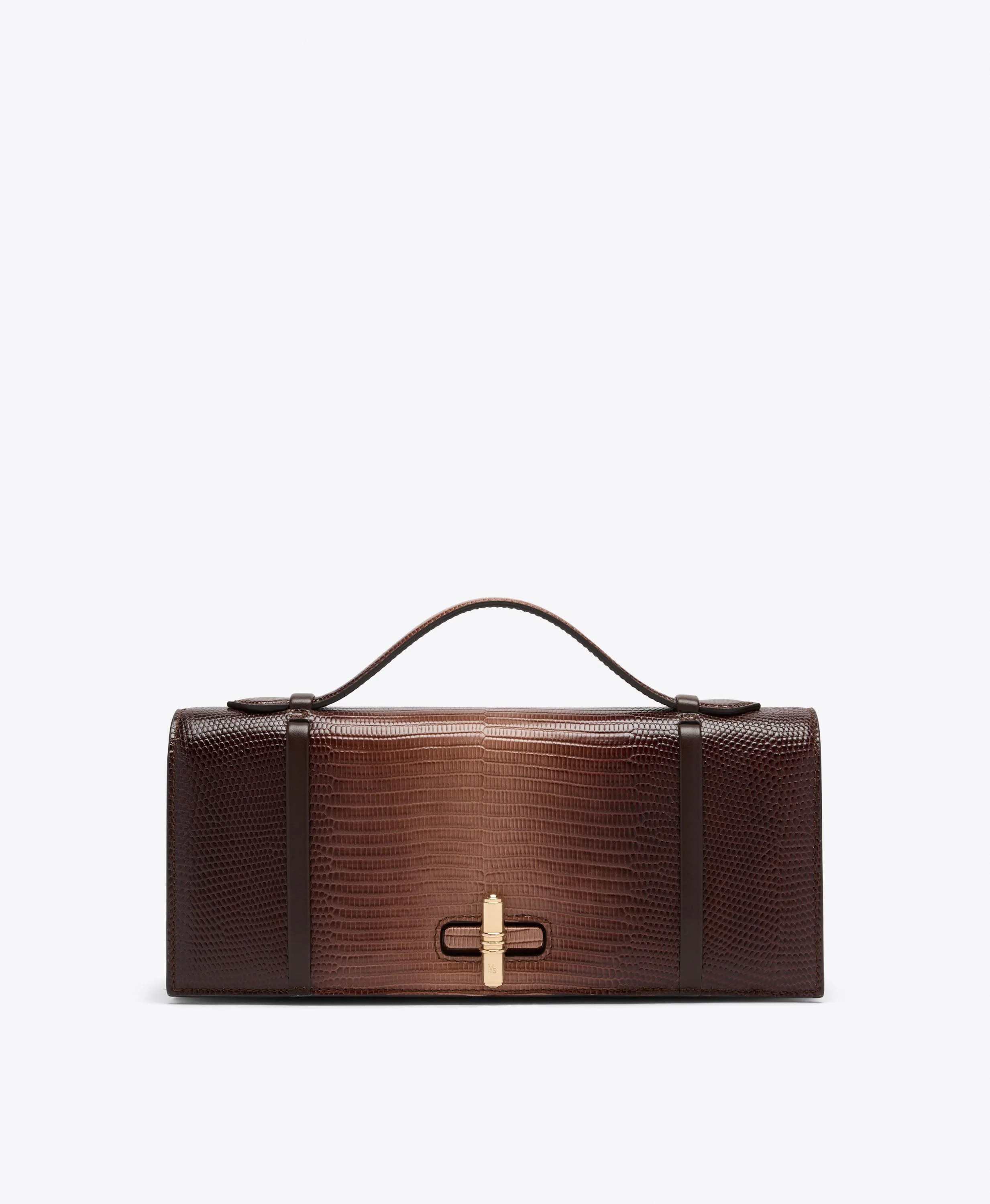 This season, the May clutch presents a study in tone and texture. Hand-finished in taupe degrade embossed leather, its gradient surface adds depth to a clean, rectangular form. A signature gold twist-lock, inspired by vintage metal lipstick cases, completes the design. - Colour: Taupe - Material: Degrade Embossed Leather Tejus/Nappa - Lining: Microfibre Fabric - Style: Top Handle Bag - Handmade in Italy SIZE & FIT - Width: 27cm - Depth: 6cm - Height: 12cm - Additional chain drop: 50cm