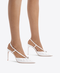 A statement of timeless elegance, designed for the spotlight. Crafted in white satin, the Moore slingback is adorned with cascading rows of crystals and pearls that catch the light with every step. Set on a 90mm stiletto heel, this pointed-toe silhouette is a refined choice for brides-to-be and elevated evening occasions, inspired by Grace Kelly's iconic wardrobe in To Catch a Thief. - Colour: White - Material: Satin - Sole and Lining: 100% Leather - Style: Heeled Slingbacks - Handmade in Italy - Fitting: True to size SIZE & FIT - True to size - Italian sizing - Model wears size IT37, US7, UK4 - Heel height 90mm/3.5in