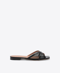The Perla flat steps into new territory in black mesh. This refined flat sandal blends structure and softness, crafted in sheer black mesh with smooth Nappa leather trims. Its squared toe and sleek monoblock heel create a modern silhouette with a barely-there feel. Perla is a wardrobe chameleon-perfect for pairing with everything from fluid tailoring to easy day dresses. - Colour: Black - Material: Mesh/Nappa - Sole and Lining: 100% Leather - Style: Flat Sandals - Handmade in Italy - Fitting: True to size SIZE & FIT - True to size - Italian sizing - Model wears size IT37, US7, UK4 - Heel height 10mm/0.4in