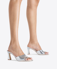 A new silhouette, inspired by the femme fatales of classic noir cinema. The Roxanne mule captures timeless allure through a modern lens, crafted in silver metallic Nappa leather. Its squared toe and single strap sculpt a bold, architectural silhouette, while the flared 70mm block heel brings comfort and confidence. Roxanne pairs as effortlessly with evening wear as it does with sharp tailoring. - Colour: Silver - Material: Metallic Nappa - Sole and Lining: 100% Leather - Style: Heeled Sandals - Handmade in Italy - Fitting: True to size SIZE & FIT - True to size - Italian sizing - Model wears size IT37, US7, UK4 - Heel height 70mm/2.7in