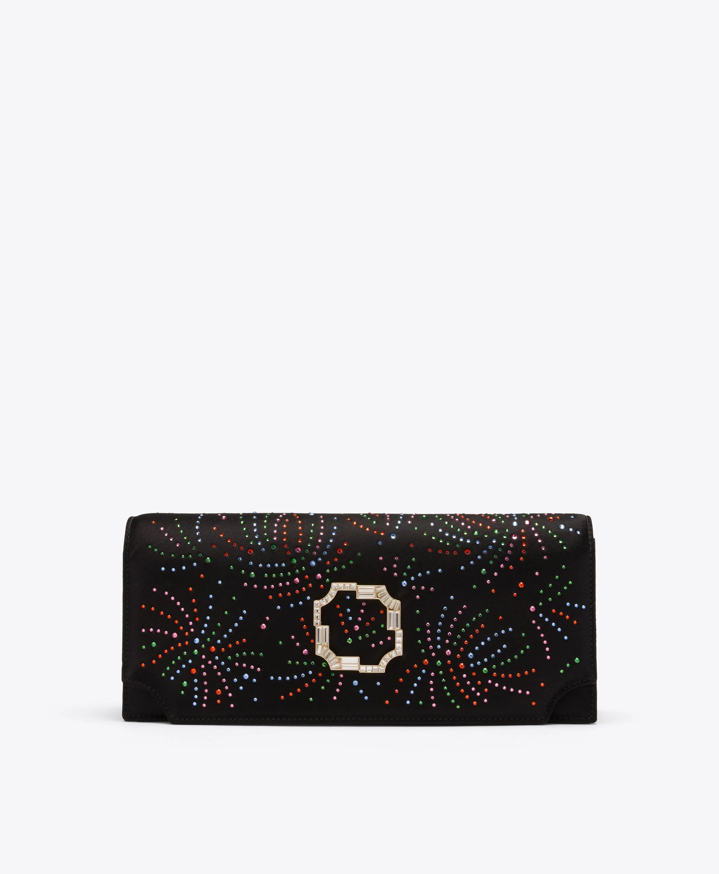 A statement of evening elegance. In black satin scattered with multicoloured crystals, the Vivien clutch captures the drama of a fireworks display. Finished with a gold crest buckle and magnetic closure, it's a striking piece designed to illuminate every after-dark moment. - Colour: Black - Material: Satin - Lining: Satin - Style: Clutch Bag - Handmade in Italy SIZE & FIT - Width: 27cm - Depth: 6.5cm - Height: 12cm - Additional chain drop: 47cm
