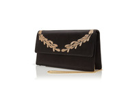 Black satin rectangular clutch bag featuring embroidered gold cascading leaf design and flap over detail. Contains internal compartment, mirror and removable chains with two length options. Magnetic closure. Upper: 72% viscose, 28% silk.Lining: 72% viscose, 28% silk.Made in Italy.Height: 12 cm.Length: 24 cm.Width: 6 cm.Straps measure 37 cm and 110 cm. Product ID: 325-3134-0001
