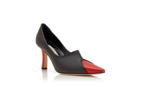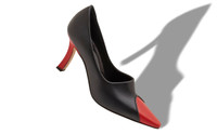 Black calf leather pointed toe pumps featuring red toe cap with black edging and red angular high heel. Upper:100% calf leather.Sole:100% calf leather.Lining:100% kid leather.Heel measures:90 mm. Italian sizing. Made in Italy. Product ID: 325-3050-0001
