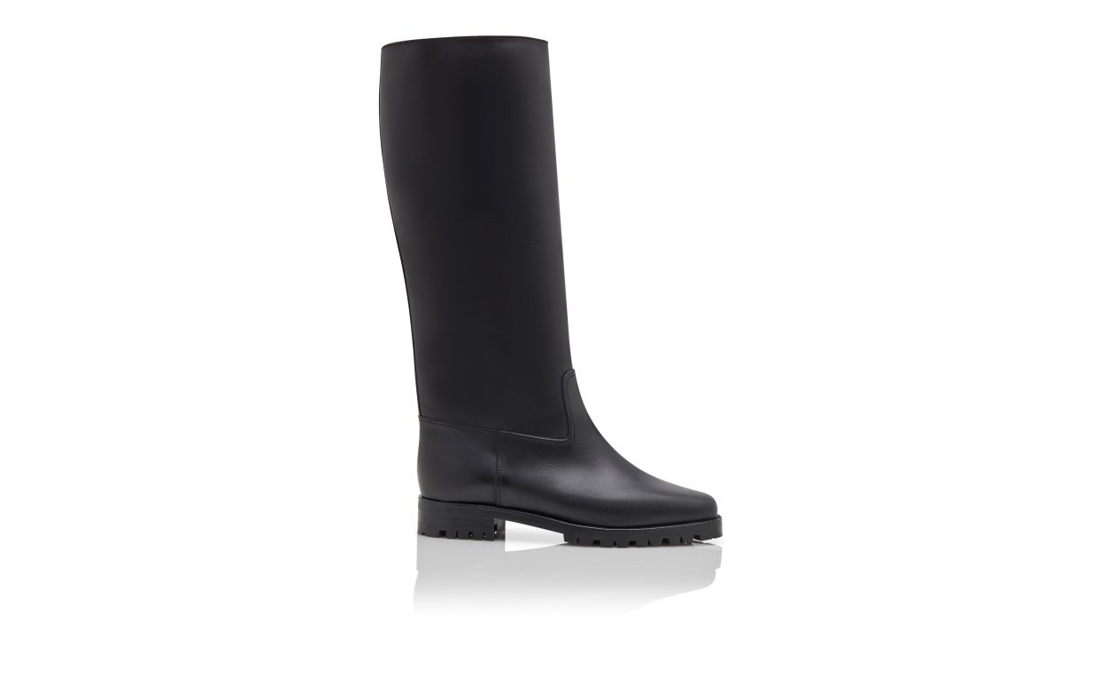 Black calf leather knee high boots featuring slip on design with relaxed fit and rubber sole. Upper: 100% calf leather. Sole: 50% rubber, 50% cow leather. Lining: 100% kid leather. Heel measures 10 mm. Italian sizing. Made in Italy. Product ID: 320-1578-0001
