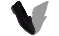 Black calf suede loafers featuring apron cut design and flat stacked heel. Upper: 100% calf suede. Sole: 100% calf leather. Lining: 100% kid leather. Heel measures 10 mm. Italian sizing. Made in Italy. Product ID: 225-1881-0001