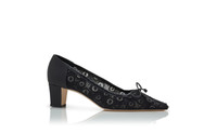 Black lace almond toe pumps featuring bow detail and a low block heel. Upper:90% fabric, 10% silk.Sole:100% calf leather.Lining:100% kid leather.Heel measures:50 mm.Italian sizing. Made in Italy. Product ID: 425-2106-0001