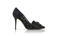 Black lace pointed toe pumps featuring pleated detailing and decorative jewel embellishment. Finished with a stiletto high heel. Upper:80% fabric, 20% silk.Sole:100% calf leather.Lining:100% kid leather.Heel measures:105 mm.Italian sizing. Made in Italy. Product ID: 425-2093-0001