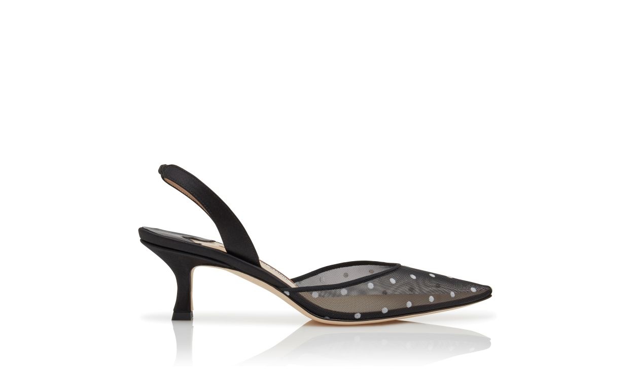 Black mesh pointed toe slingback pumps featuring white polka dot design, elasticated slingback detail and stiletto low heel. Upper: 90% polyamide, 10% satin. Sole: 100% calf leather. Lining: None. Heel measures 50 mm. Italian sizing. Made in Italy. Product ID: 225-1980-0002
