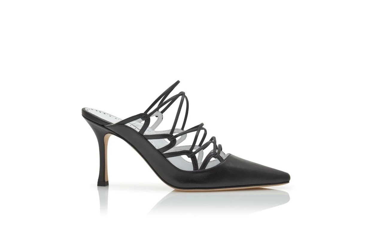 Black nappa leather almond toe mules featuring lace-up strap detailing and a stiletto high heel. Upper:100% lamb nappa.Sole:100% calf leather.Lining:100% kid leather.Heel measures:90 mm.Italian sizing. Made in Italy. Product ID: 425-2111-0001