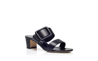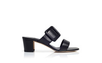 Black nappa leather open toe mules featuring decorative buckle detail and finished with mid block heel. Upper: 100% lamb nappa. Sole: 100% calf leather. Lining: 100% kid leather. Heel measures 50mm. Italian sizing. Made in Italy. Product ID: 121-1767-0002