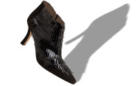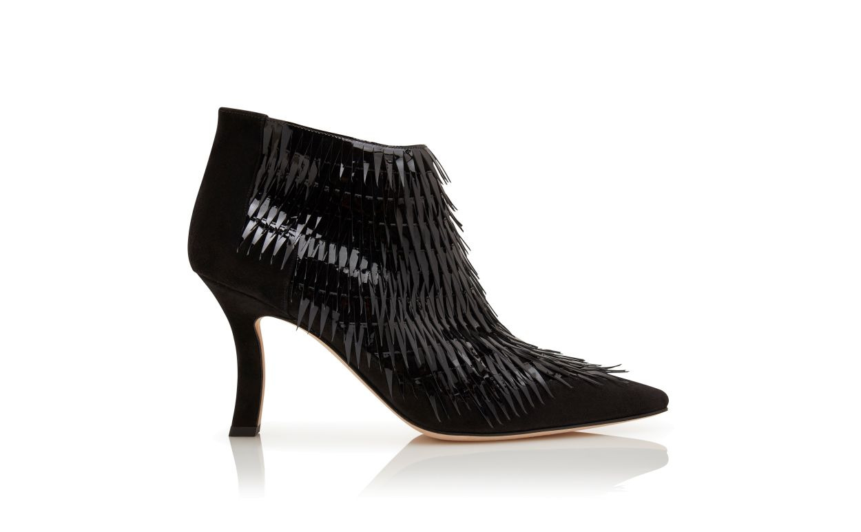Black patent leather pointed toe ankle boots featuring spiked patent leather design details, side zip closure and flared block high heel. Upper:60% patent calf, 40% kid suede.Sole:100% calf leather.Lining:100% calf leather.Heel measures:90 mm.Italian sizing. Made in Italy. Product ID: 325-3006-0001