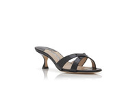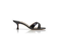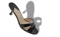 Black patent leather open toe mules featuring crossover straps and kitten heel. Upper: 100% patent calf leather. Sole: 100% cow leather. Lining: 100% goat skin. Heel measures 50mm. Italian Sizing. Made in Italy. Product ID: 120-1242-0001