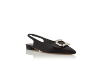 Black satin pointed toe pumps featuring decorative squared crystal stone buckle and elasticated slingback design. Finished with a flat stacked heel. Upper:72% viscose, 28% silk.Sole:100% calf leather.Lining:100% kid leather.Heel measures:10 mm.Italian sizing. Made in Italy. Product ID: 425-2233-0005