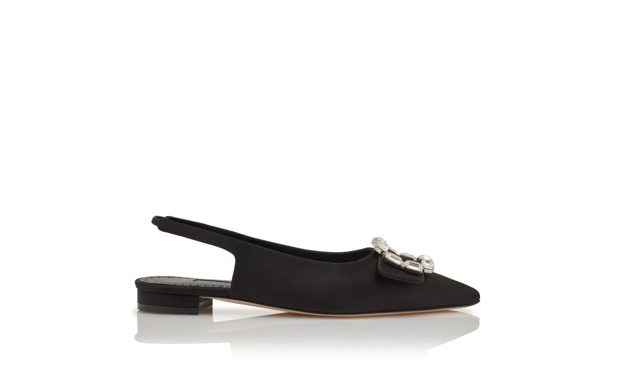 Black Satin Crystal Buckle Slingback Flat Pumps