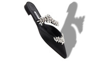 Black satin mules featuring crystal embellishment, instep strap with crystal embellishment and flat stacked heel. Upper: 72% viscose, 28% silk. Sole: 100% cow leather. Lining: 100% goat skin. Heel measures 10mm. Italian sizing. Made in Italy. Product ID: 122-1947-0007