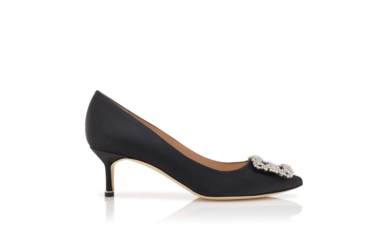 Black satin almond toe pumps featuring a clear crystal buckle and stiletto low heel. Upper:72% viscose, 28% silk.Sole:100% calf leather.Lining:100% kid leather.Heel measures:50mm.Italian sizing. Made in Italy. Product ID: 9XX-0315-0046