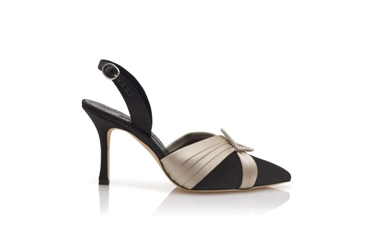 Black satin pointed toe pumps featuring cream pleated silk detailing, clear crystal jewel embellished buckle and slingback strap with buckle closure. Finished with a stiletto high heel. Upper:72% viscose, 28% silk.Sole:100% calf leather.Lining:100% kid leather.Heel measures:90 mm.Italian sizing. Made in Italy. Product ID: 126-3137-0001