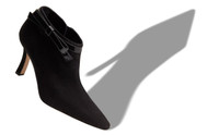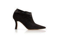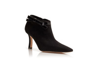 Black suede pointed toe shoe booties featuring black patent leather bow detail, side zip closure and flared block high heel. Upper: 90% kid suede, 10% patent calf. Sole: 100% calf leather. Lining: 100% kid leather. Heel measures 90 mm. Italian sizing. Made in Italy. Product ID: 225-1828-0001