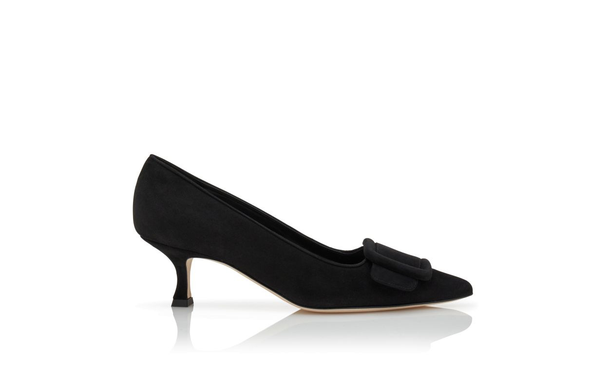 Black suede pointed toe pumps featuring decorative buckle detail and stiletto low heel. Upper: 100% kid suede. Sole: 100% calf leather. Lining: 100% kid leather. Heel measures 50mm. Italian sizing. Made in Italy. Product ID: 219-0173-0003