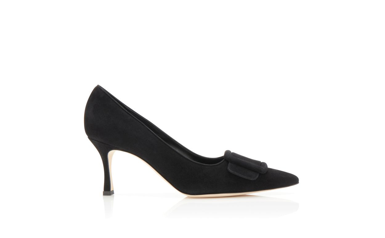 Black suede pumps featuring pointed toe, decorative buckle detail and stiletto mid heel. Upper: 100% kid suede. Sole: 100% cow leather. Lining: 100% goat skin. Heel measures 70mm. Italian sizing. Made in Italy. Product ID: 219-0373-0006