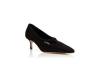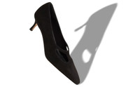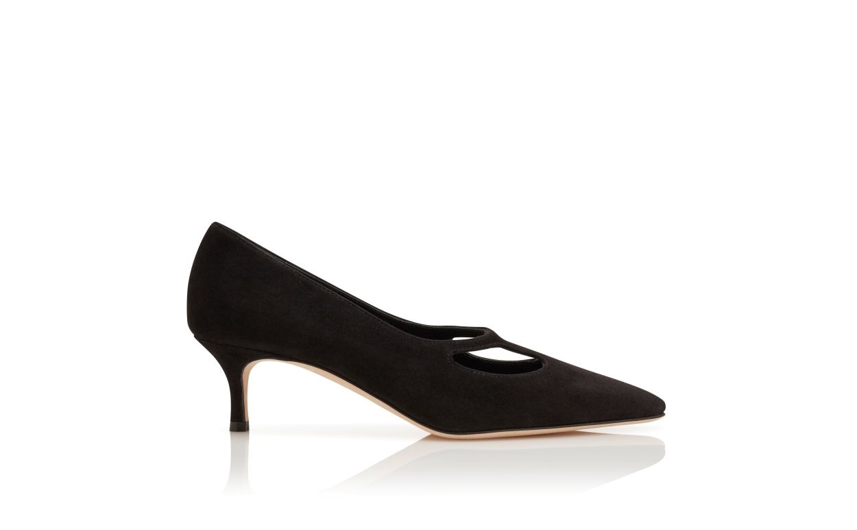 Black suede pointed toe pumps featuring circular cut out details and stiletto low heel. Upper: 100% kid suede. Sole: 100% calf leather. Lining: 100% kid leather. Heel measures 50 mm. Italian sizing. Made in Italy. Product ID: 225-1806-0001