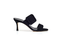 Black suede open toe mules featuring two front broad straps with an oversized decorative buckle and finished with stiletto mid heel. Upper: 100% kid suede. Sole: 100% cow leather. Lining: 100% kid leather. Heel measures 70mm. Italian sizing. Made in Italy. Product ID: 419-0479-0007